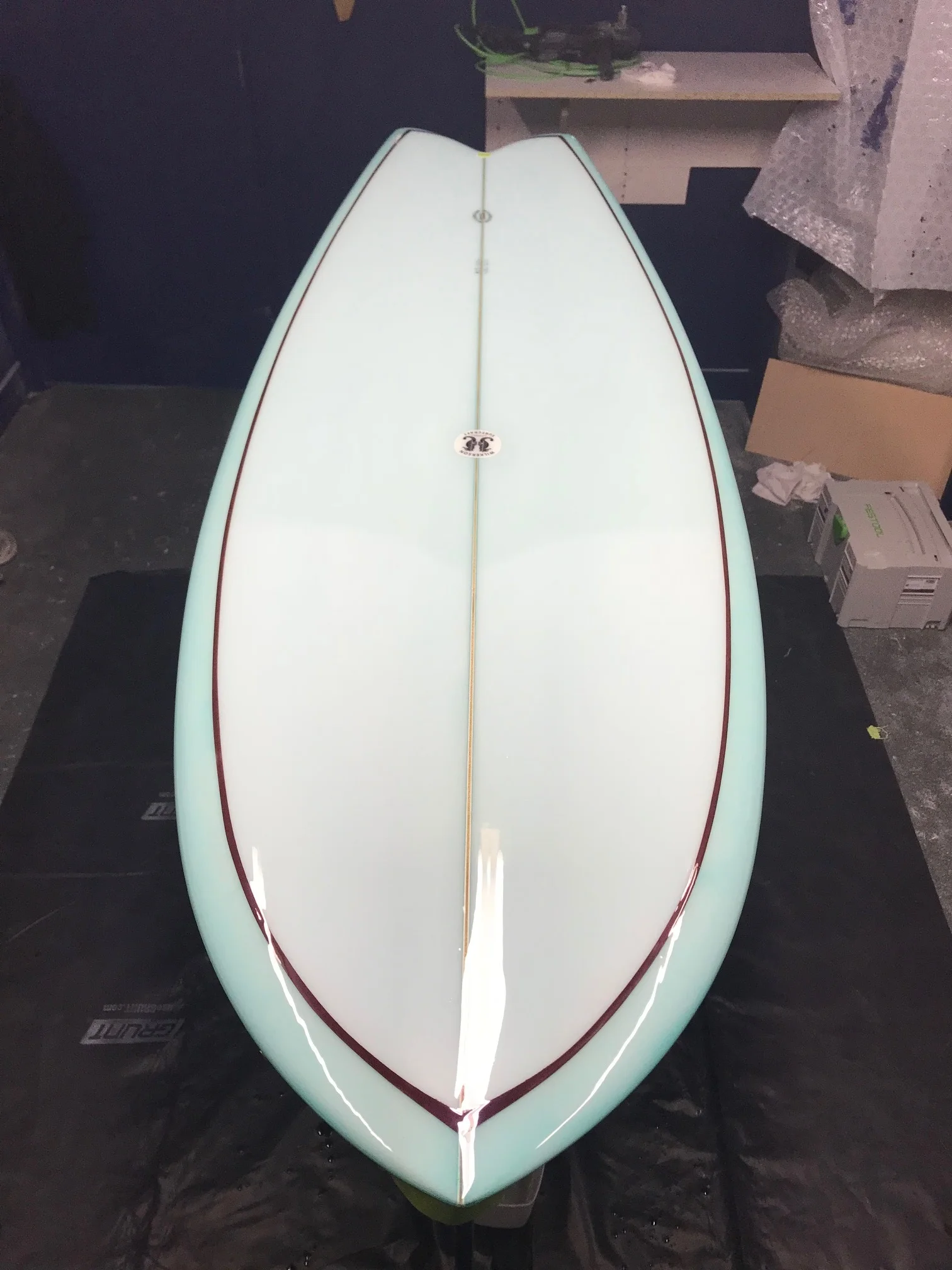 TRUTH BE TOLD THIS VERSITILE FISH DESIGN BEGAN AS A KNEEBOARD. BORN IN SAN DIEGO WATERS THE FISH OFFERS UNLIMITED SPEED. POINT A TO POINT B AS FAST AS POSSIBLE. ITS WIDER OUTLINE OFFERS STABILITY AND CARRIES SPEED THRU THE FLAT SECTIONS OF WAVES. MY INTERPRETATION OF THIS DESIGN FEATURES 60/40 RAIL SHAPE, GLASS ON HANDMADE WOOD KEEL FINS AND CONTEMPORARY BOTTOM CONTOURS. A SLITE ROLLED ENTRY TO SINGLE CONCAVE THRU THE FINS OFFERING UP A SMOOTH RIDE.